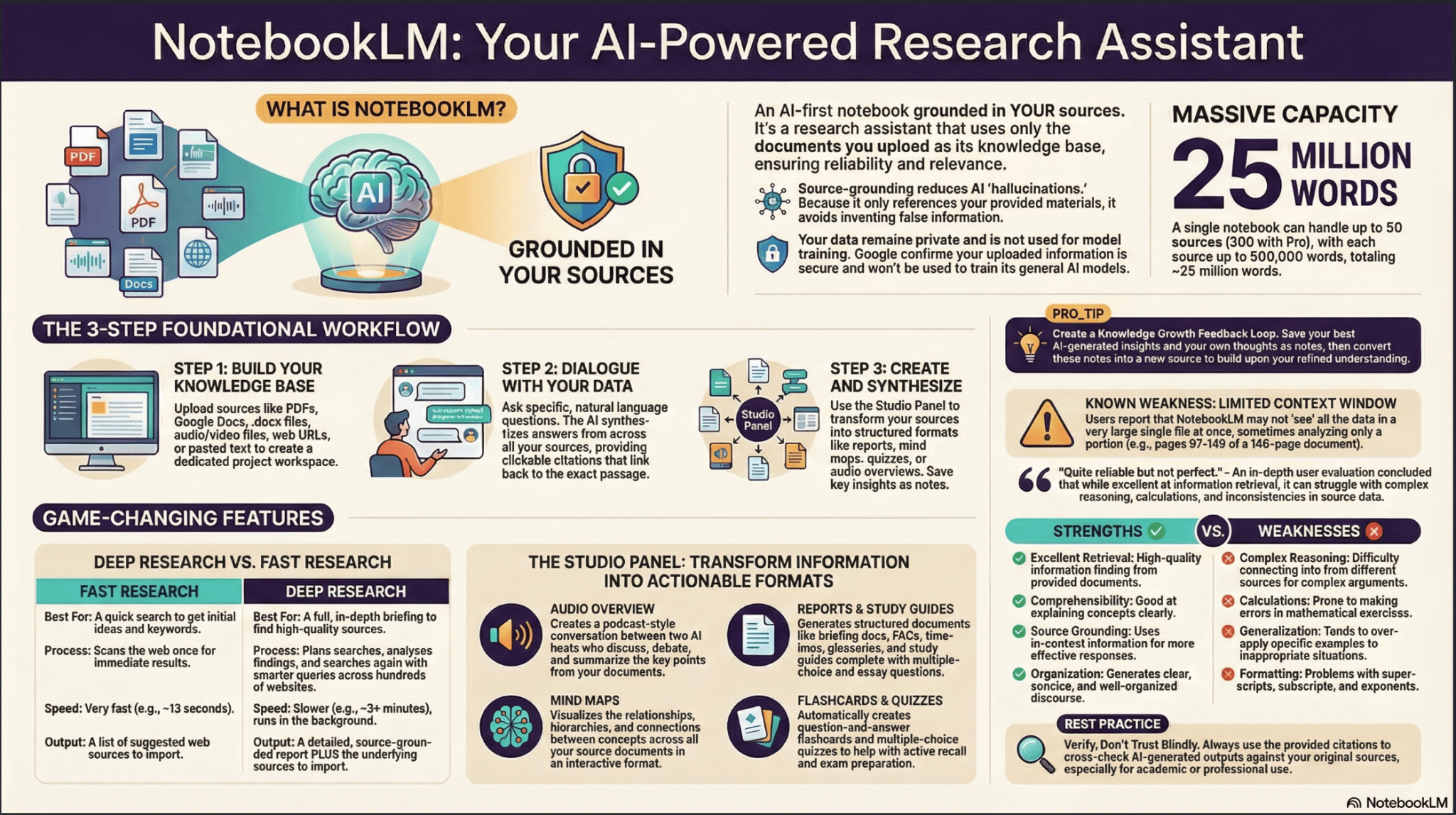 A key feature of NotebookLM is its source-grounded generation model. Instead of producing answers solely from a pretrained language model, it generates responses based on documents uploaded by the user.
