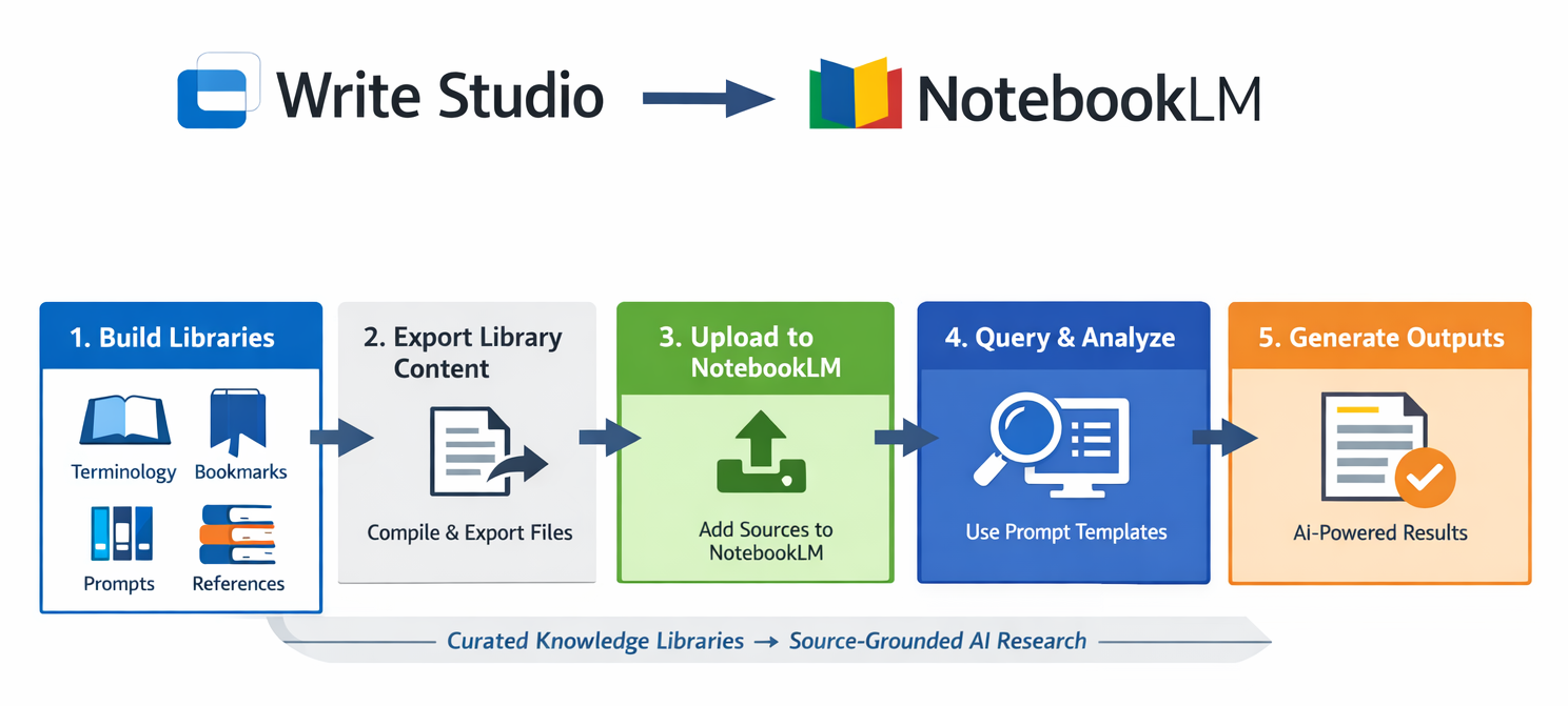 Platforms such as Write Studio provide reusable libraries for terminology, bookmarks, prompts, and references, allowing researchers to maintain a curated knowledge base that can be used across writing projects. When these libraries are combined with NotebookLM, they create a powerful workflow for academic research and writing.